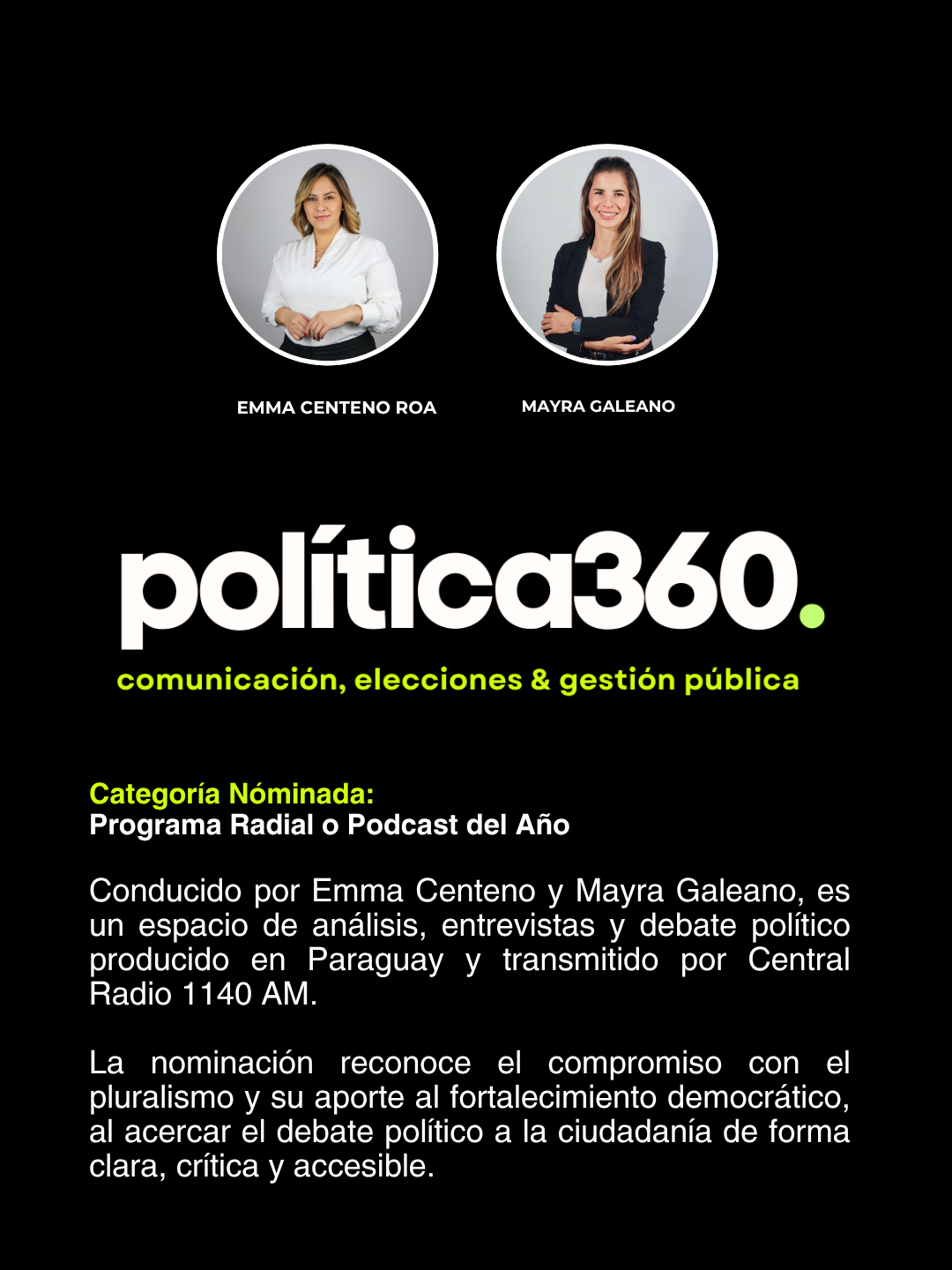 El programa Política 360, conducido por Emma Centeno y Mayra Galeano, emitido por Central Radio 1140AM, está nominado en la categoría Programa Radial o Podcast Político del Año.